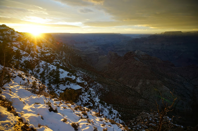 After setting foot on land again, we drove to Desert View Watchtower, which is by far the most impressing viewpoint of the ones we visited. The weather circumstances made this feeling so much stronger – the predicted snow that could fall down at any moment really fed our excitement! Also the clouds were acting if they were about to put up the show of their lives, and they actually did when the sunset kicked in. The most beautiful colors appeared, not only the ‘usual’ vanilla skies, but shades of purple, the brightest blue and even green surprised us. I may begin to sound like a broken record, but it made the landscape look totally surreal.
